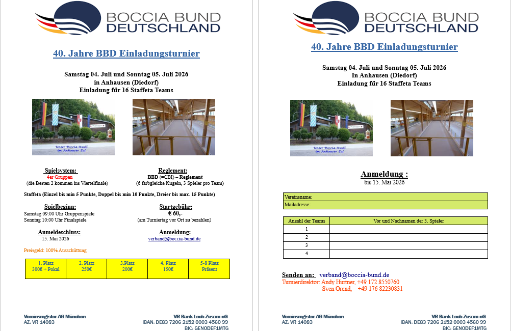 Modalità: torneo internazionale su invito in modalità „staffetta“ seguito da un „Schwarzlichtparty“ nel Bocciastadel Anhausen.